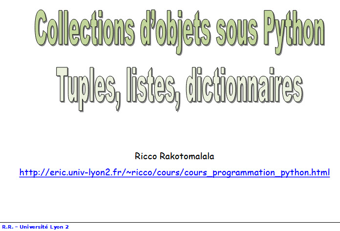 Ce support de cours sur les collections en Python, développé par Ricco de l'Université Lyon 2, offre une vision complète et structurée des différentes structures de données disponibles dans le langage Python. Présenté sous forme de slides pédagogiques, ce document aborde de manière systématique les collections fondamentales qui constituent le cœur de la manipulation des données en programmation Python.