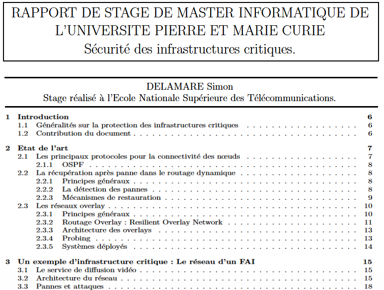Ce document est un rapport de stage consacré à la protection des infrastructures critiques, avec un accent sur la connectivité et la disponibilité des services lors de pannes ou d’attaques. Après avoir défini les enjeux de la continuité d’activité, l’auteur présente un état de l’art du routage dynamique et des réseaux overlay pour accélérer la récupération du trafic.